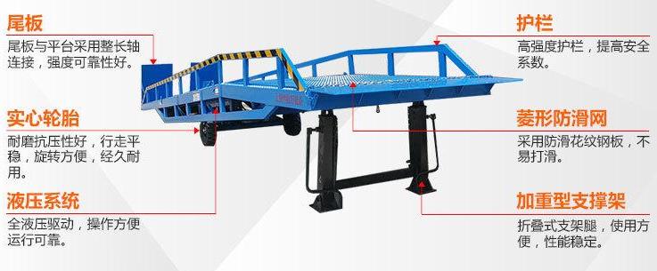 移動式登車橋適用于卸頻繁、企業、倉庫、車站、碼頭、倉儲物流基地、郵政運輸、物流配送等單位的貨物裝卸。
